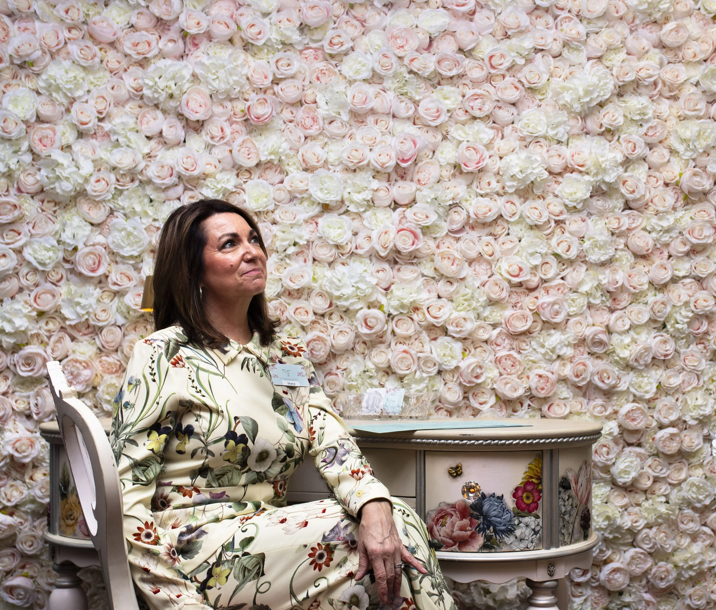 Stacy Brand poses in front of her flower wall displayed at the SOKY Bridal Expo at the Knicely Conference Center on Sunday, Jun. 21, 2023. Brandau, 58 years old, quit her corporate job and says she “took a chance” on her flower business. Brandau said the bridal expo is her first time selling her work and it couldn’t have gone better.
